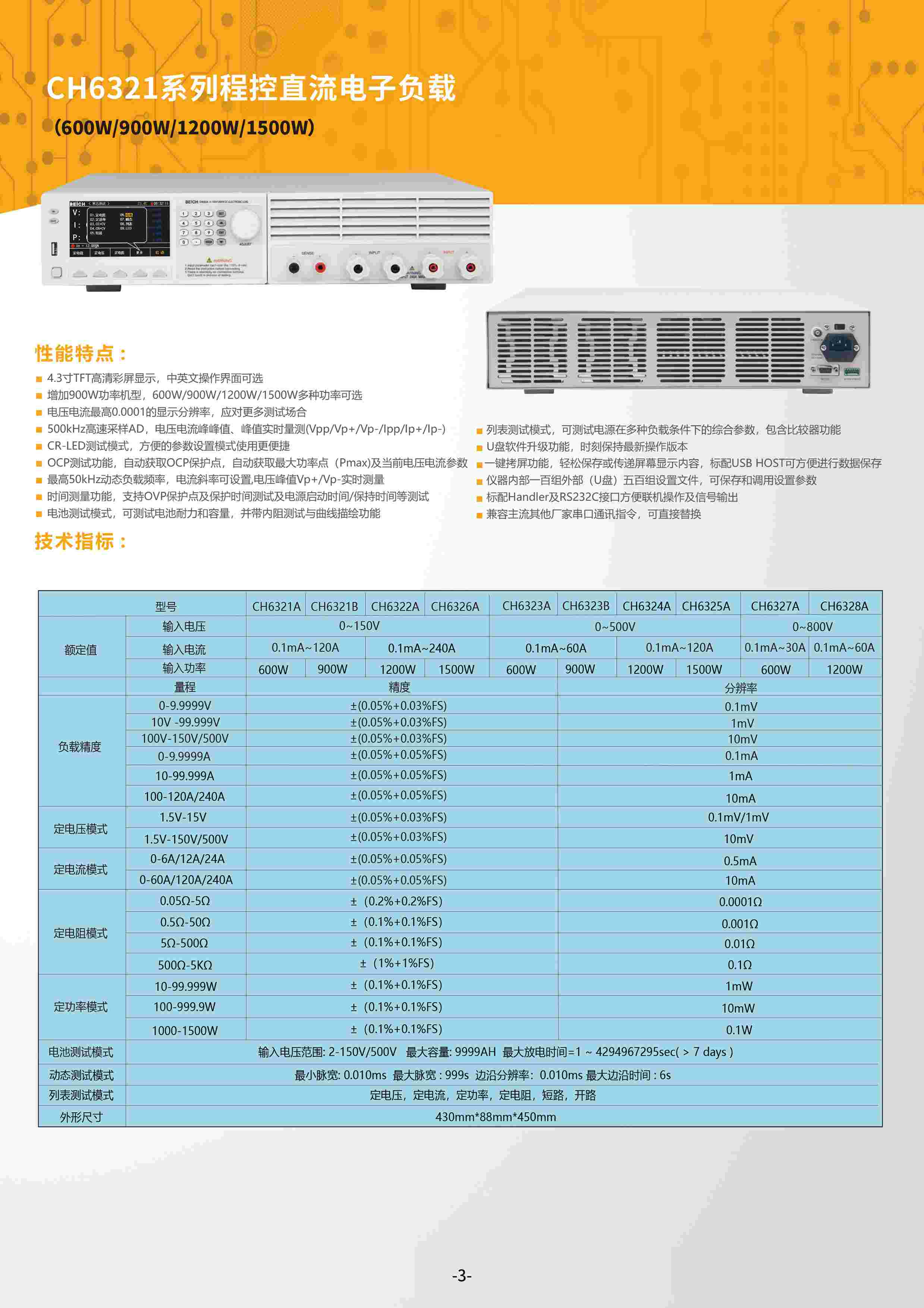 CH6321X 系列程控直流電子負(fù)載主機(jī)采用高性能 ARM 處理器配合高性能高速采樣 AD;4.3 寸 TFT 彩屏支持中英文界面,配合精心設(shè)計(jì)的引導(dǎo)式菜單,操作得心應(yīng)手;顯示信息豐富,負(fù)載操作與快充電壓選擇同時(shí)顯示;擁有 0.0001的更高顯示分辨率,更能精確監(jiān)控被測(cè)產(chǎn)品的電壓電流細(xì)節(jié);USB HOST 可以方便的使用 U 盤進(jìn)行數(shù)據(jù)保存及固件升級(jí);比較器功能配合 HANDLER 接口,使得生產(chǎn)線批量測(cè)試和系統(tǒng)化測(cè)試更加有保障;擁有豐富的負(fù)載功能:定電流 CC,定電壓 CV,定功率 CP,定電阻 CR,電池放電測(cè)試(屏幕可以顯示實(shí)時(shí)放電曲線),動(dòng)態(tài)測(cè)試(測(cè)試電源動(dòng)態(tài)輸出性能),列表測(cè)試(測(cè)試電源在多種負(fù)載條件下的表現(xiàn));柔性的軟硬件構(gòu)架可滿足用戶訂制組合測(cè)試功能的要求,從而提高生產(chǎn)線測(cè)試效率;智能化的風(fēng)扇控制和優(yōu)良的散熱性能,配合過(guò)電壓、過(guò)電流、過(guò)功率、過(guò)熱和電壓極性反接等多種完善的保護(hù)報(bào)警措施,使得儀器更具可靠性;儀器全系標(biāo)配有 RS232 接口,配合豐富的 SCPI 指令集,可方便連接到電腦,進(jìn)行實(shí)時(shí)數(shù)據(jù)采集和儀器控制。性能優(yōu)越的電子負(fù)載可廣泛運(yùn)用于電源變壓器,充電器,開關(guān)電源,各類電池等行業(yè)的生產(chǎn)線測(cè)試、產(chǎn)品老練與實(shí)驗(yàn)室等試驗(yàn)研發(fā)領(lǐng)域。